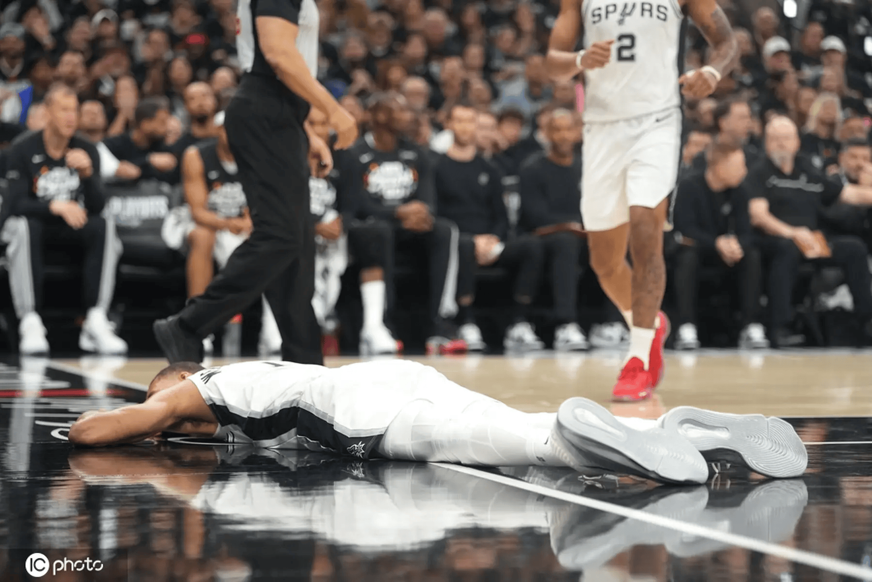 当几乎所有人都以为,马刺已经“稳了”的时候。系列赛G2,大麻烦却突然出现了。文班亚马在一个进攻回合中突然倒地,头部直接拍在地板上。